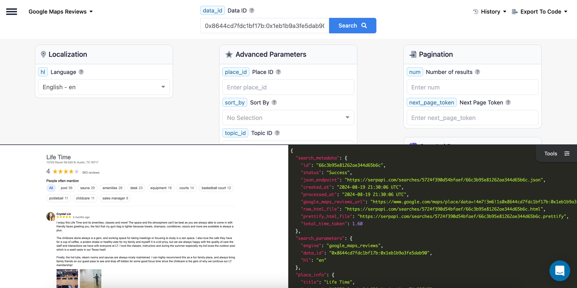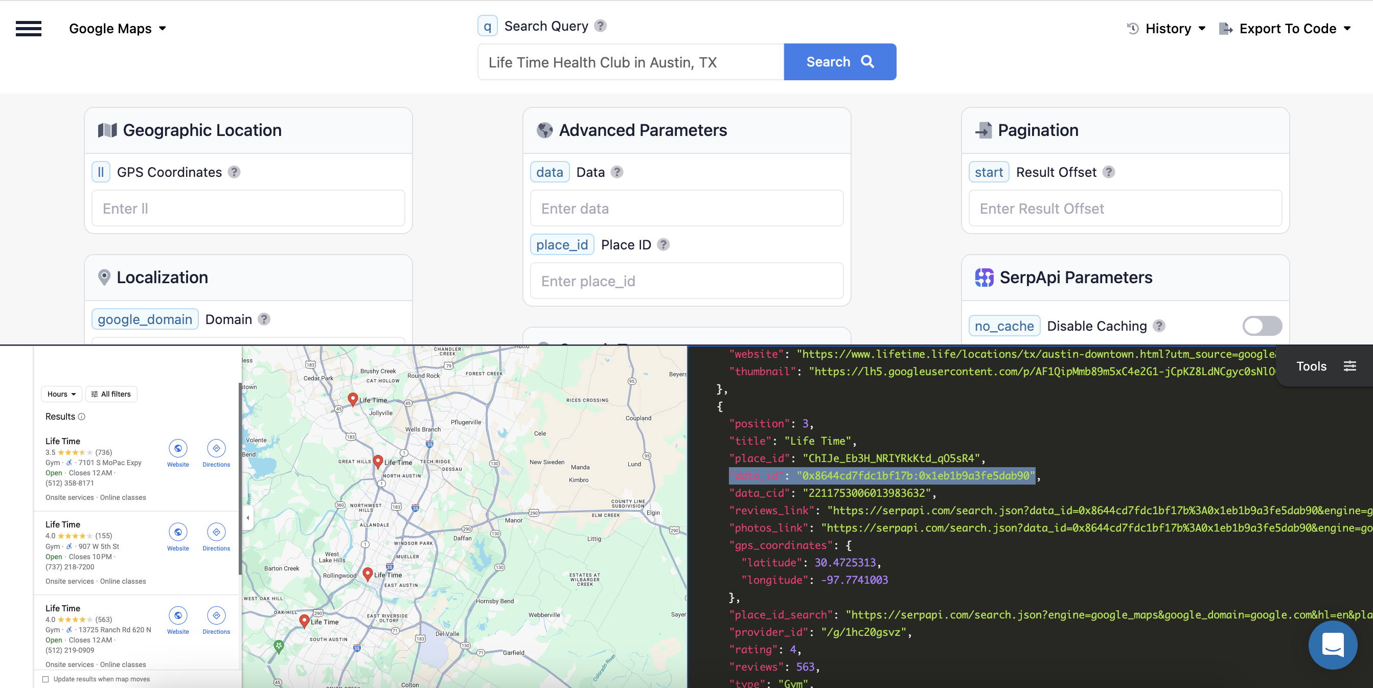First - we need the data_id in order to get the reviews for a given business. So if we want to get all the reviews for the LifeTime Health Club in Austin, TX, we first need to use the Google Maps API and search for LifeTime Health Club. Let's do this in our playground.