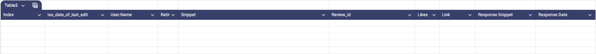 We can create a new table for collecting reviews for a particular topic. We will use the same columns as before: Index, iso_date_of_last_edit, User.Name, Rating, Snippet, Review_id, Likes, Link, Response, Response.Snippet, Response.iso_date.