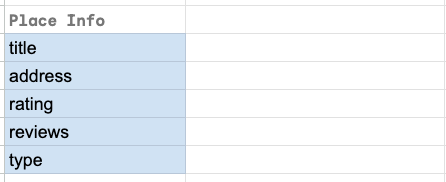To get the different parts of this metadata about the place, we will use the SERPAPI_RESULT function in Google Sheets along with the engine and data_id parameters. This information about a place is part of the place_info part of the JSON response. We will need to query for each item (title, address, etc.) individually.