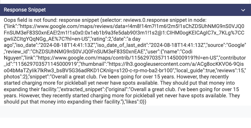 =SERPAPI_RESULT("engine=google_maps_reviews" & "&data_id=" & B2 & "&sort_by=" & B13, "reviews." & A16 & "." & LOWER(B15))The columns Index, iso_date_of_last_edit, User.Name, Rating, Review_id, Likes, and Link are available for all reviews, so the method above works. However, not all reviews may have a snippet (text along with the rating), or a response from the owner. In that case, if you try to get those fields with the function above, it may throw this error because the field does not exist in the JSON response: