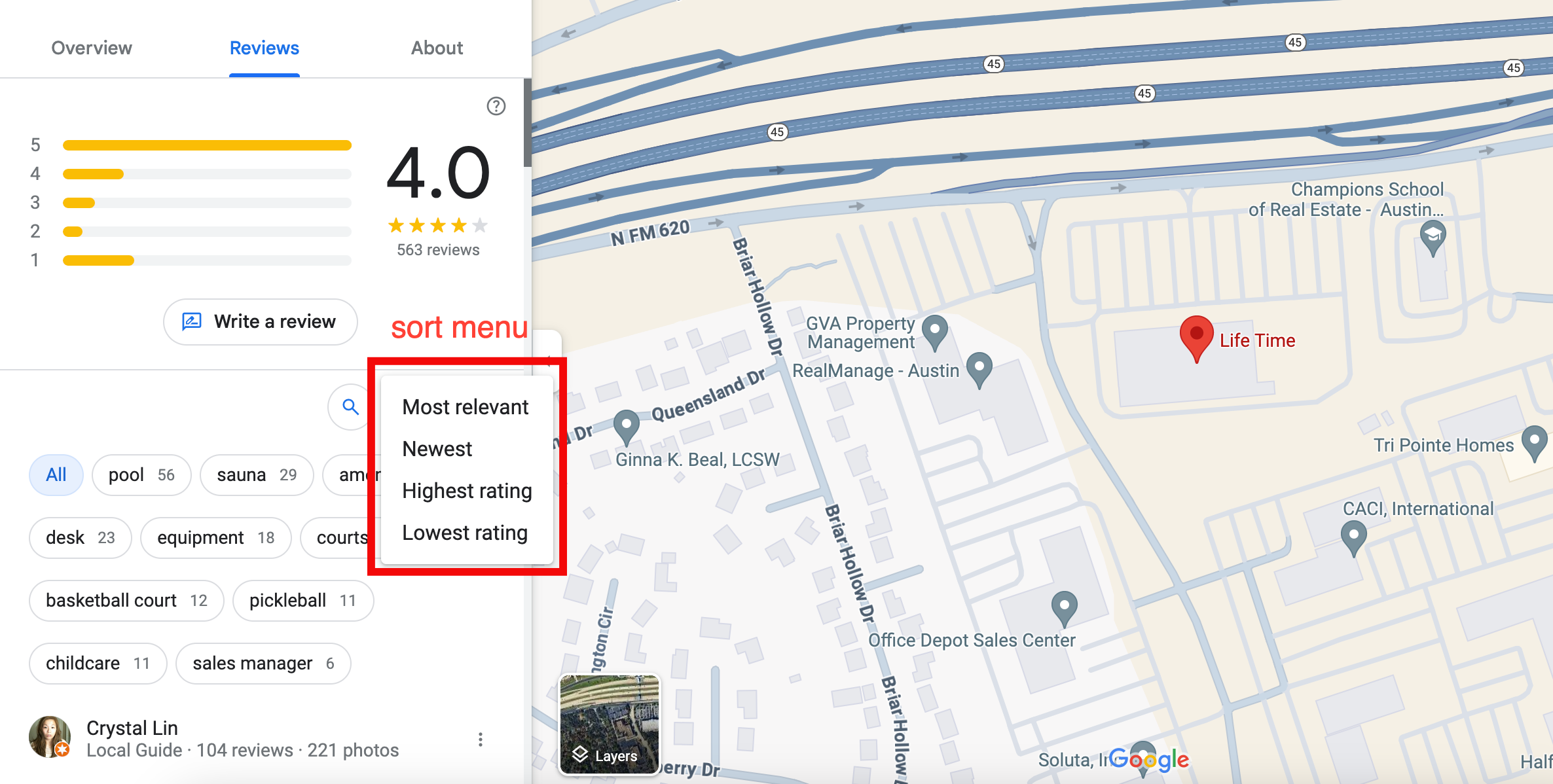 You can sort reviews by navigating to the reviews section on the Google Maps for LifeTime Health Club and clicking on "Sort By". This will display the available options to sort by.