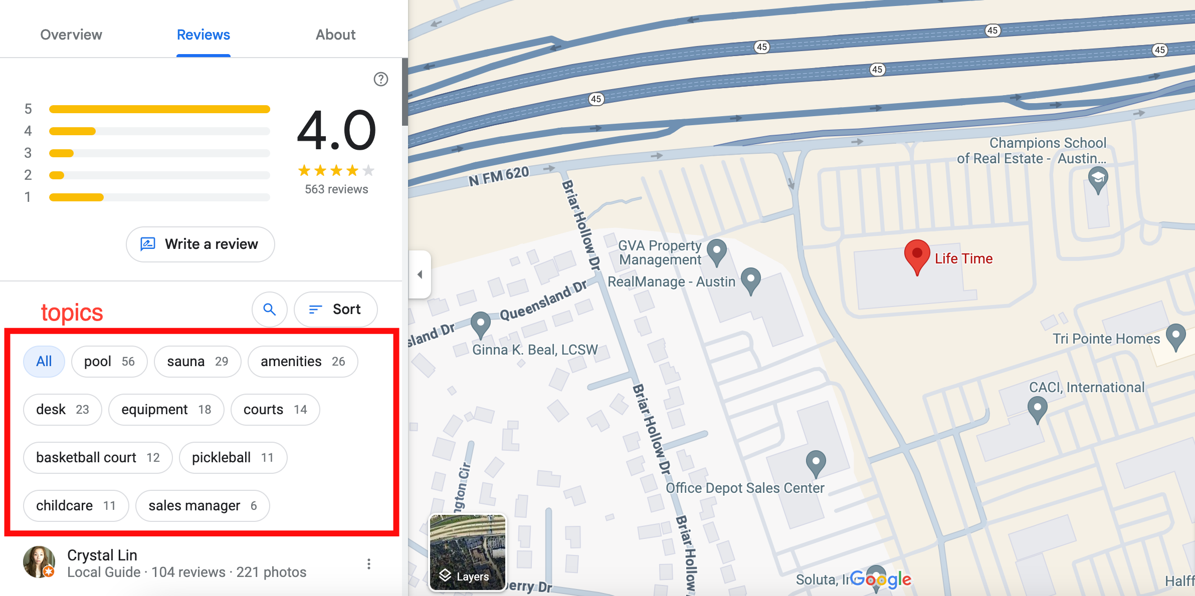 You can filter reviews by topic in the reviews section on the Google Maps page for LifeTime Health Club by clicking on one of the topic options present there.