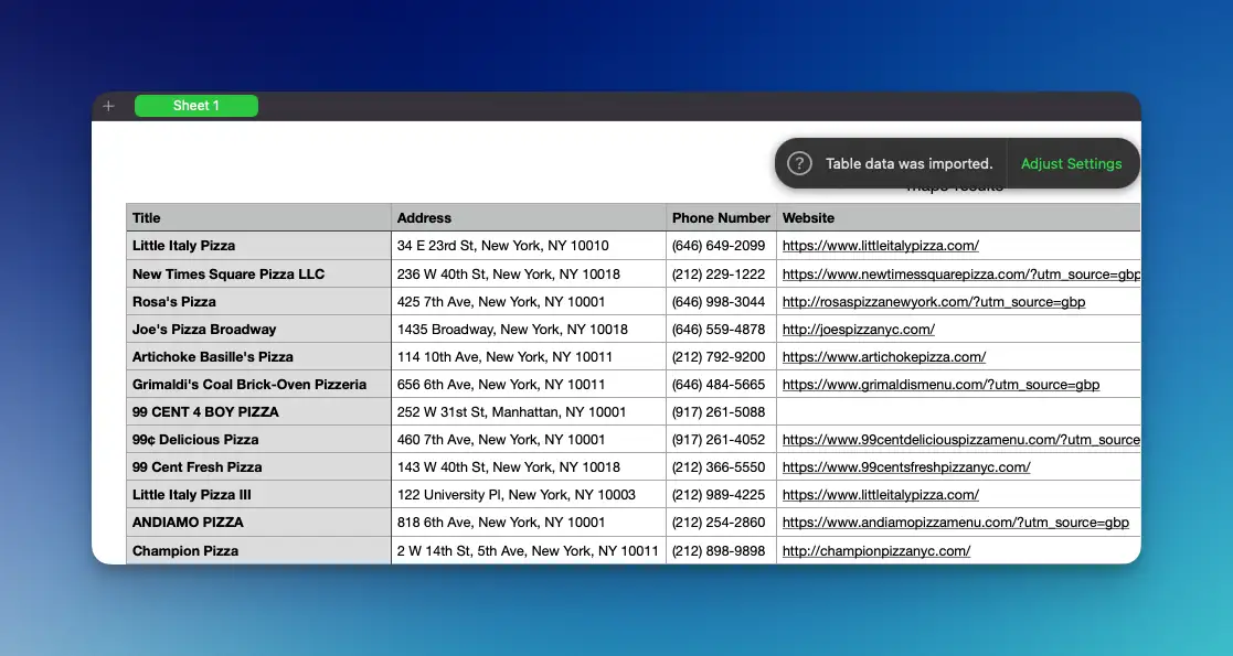 What if you need the data in csv format ? You can add the code below. This code sample shows you how to store all the local_results in the CSV file. For this example, we're saving the title, address, phone, and website.
