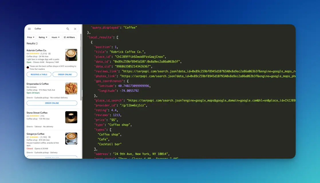 SerpApi provides a nice structured JSON with all the relevant information we need from the local Maps results. It also offers complete data like reviews and photos. So you can save time and energy to collect data from Google Maps without building your own Google Maps Scraper.