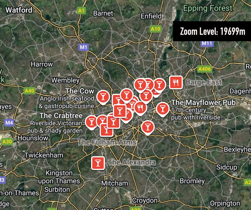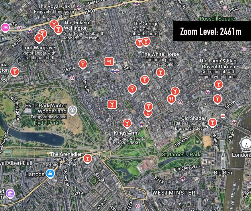 Wouldn't it be great if we could just pick a zoom/elevation level that covers the entire city and scoop up all of the pubs in one fell swoop? Sadly that's not the Google Maps way.