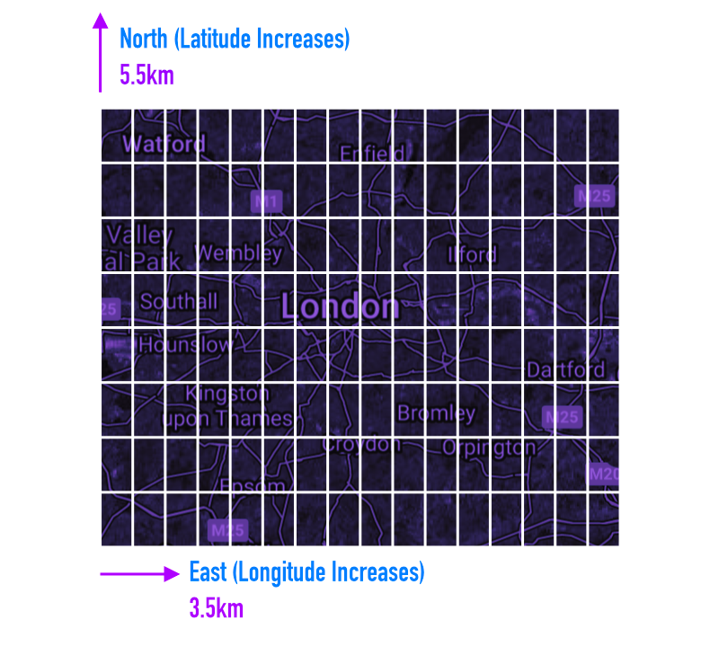 This will carve our bounding box into grid sections of 5.5 km in latitude (moving north to south), and 3.5km in longitude (moving east to west). With the measurements we're currently working with, we'll end up slicing London into a grid of 8 rows, by 16 columns.