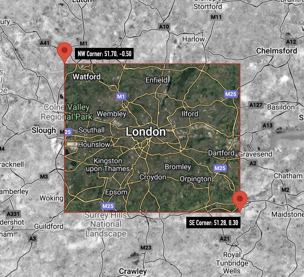Where does London begin and end? For the sake of this example we'll pick two sets of latitude/longitude values to represent the top left, and bottom right corners of our grid: