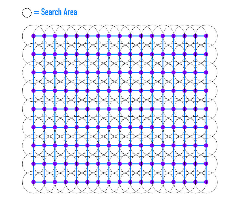 Let's take a quick look at the whole grid with search areas visualised so that we can see the overlap: