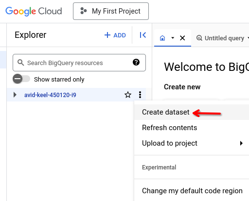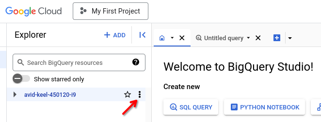 Under the Explorer sidebar, you'll see a project ID made up of two random words, a number, and i9. For example, mine is avid-keel-450120-i9.Click the 3 vertical dots next to it to open the dropdown menu.