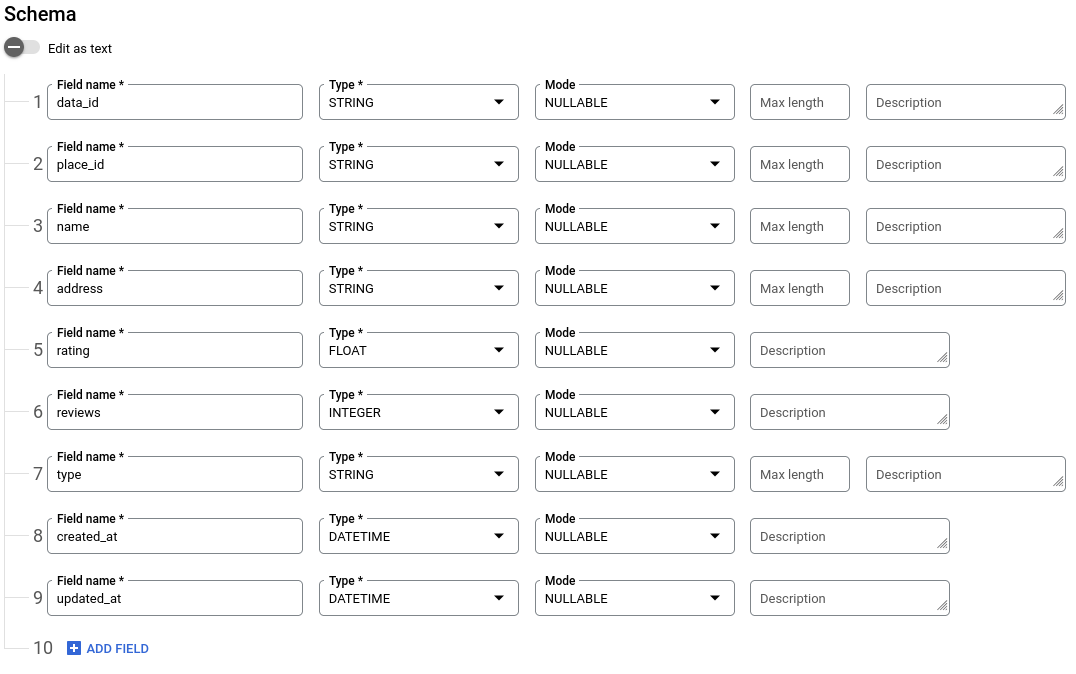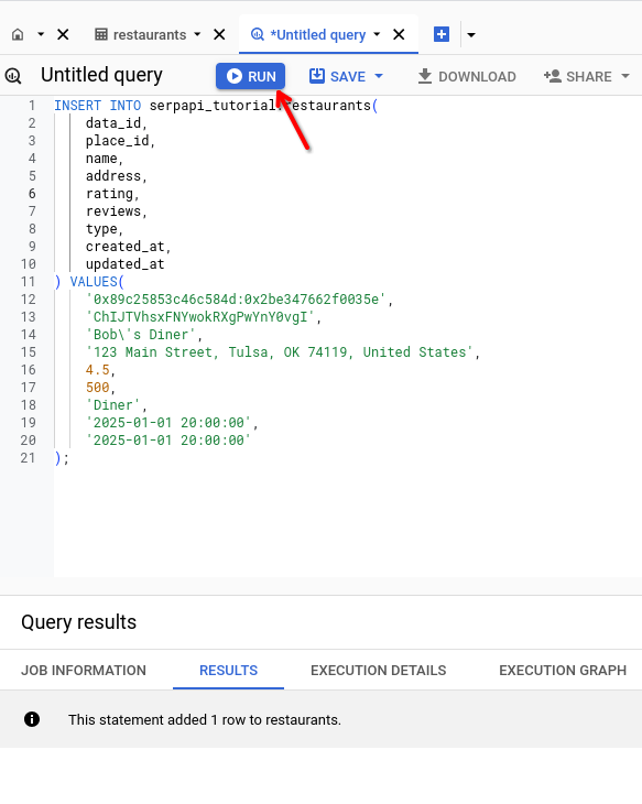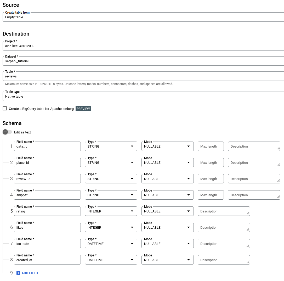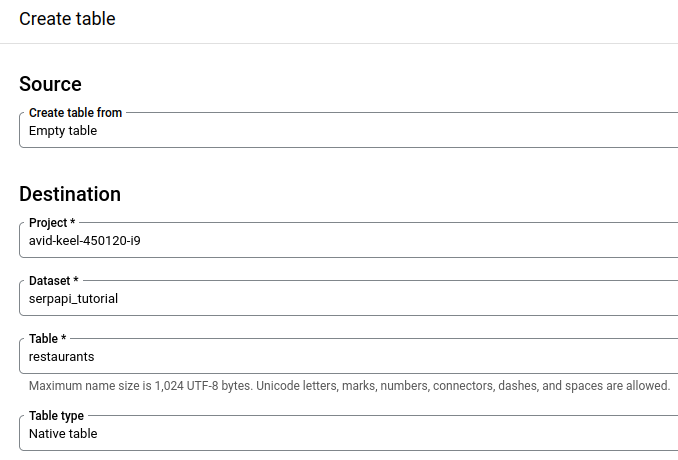 Populate the DATASET constant with yours. It should be your_project_id.your_table_name. For example avid-keel-450120-i9.serpapi_tutorial.restaurants in my case.