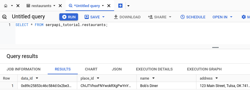 SELECT * FROM serpapi_tutorial.restaurants;Looks good!