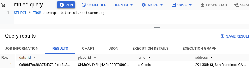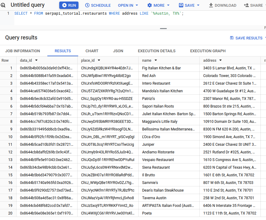 main()Try running the script and we should now have 20 Italian restaurants from Austin, TX stored in BigQuery.