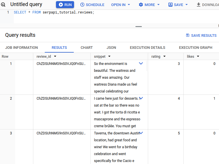 insert_into_bigquery("reviews", review_rows)Running our script, we should see Inserted successfully into your_table_id_here printed to the terminal. We should also be able to run SELECT * FROM serpapi_tutorial.reviews; and see reviews.