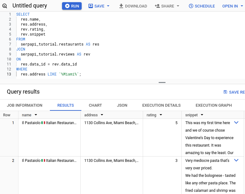 insert_into_bigquery("reviews", review_rows)We should see two successful inserts logged to the terminal. We should also be able to run the following SQL and get reviews for Italian restaurants in Miami.