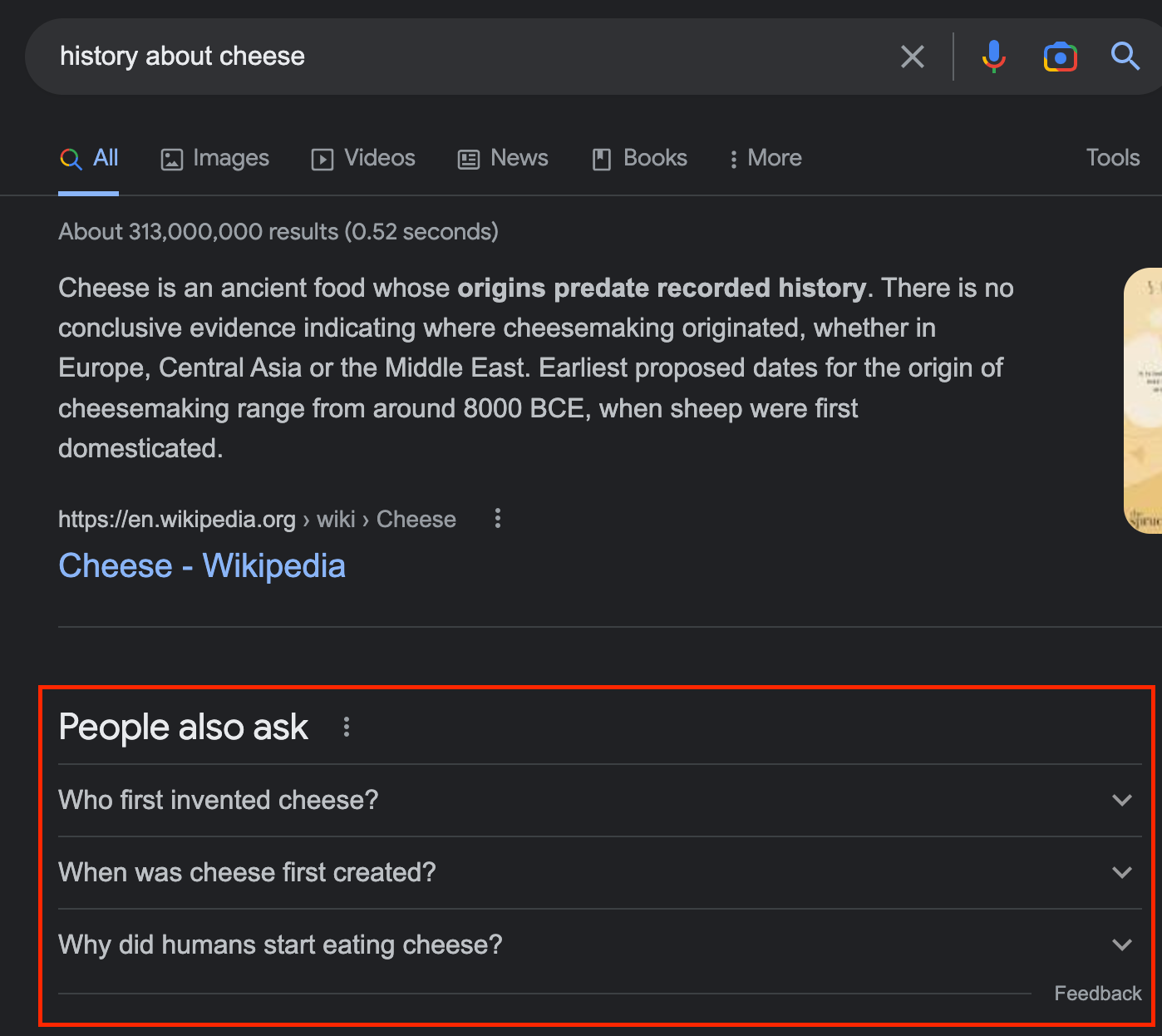 "People also ask" shows the top questions people are asking, they can be good sources for article ideas.