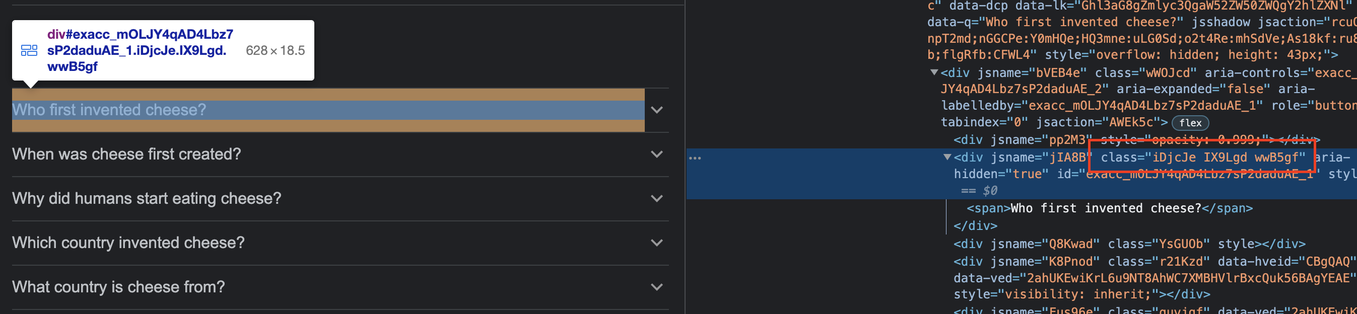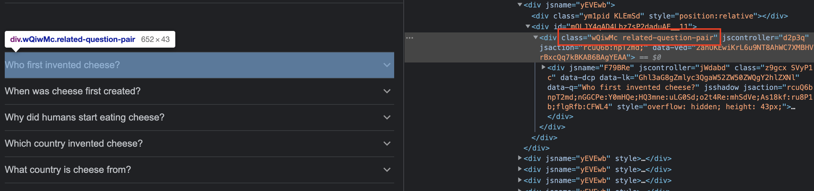The next step is to find the identifier (class, id, other attributes in the tag), in this case we will target related-question-pair class. It is better to use class that has relevant name like related-question-pair because it is less often for Google to change it. Otherwise, it is fine to use whichever class as long as it doesn't conflict with other sections.
