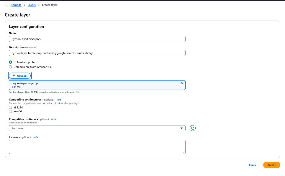 There is a bit of setup to do the first time you use our google-search-results python library with AWS Lambda. To use this library with AWS Lambda, you would need to create a layer within your lambda function. What this means is that you will package the library and its dependencies into a Lambda Layer, which is a distribution mechanism for libraries, custom runtimes, and other function dependencies. This allows you to separate the library from your function code, making it reusable and easier to manage. To do this, you need to create a .zip file with all the dependencies and upload that to create a Lambda Layer. These are the steps you need to follow to make this happen: