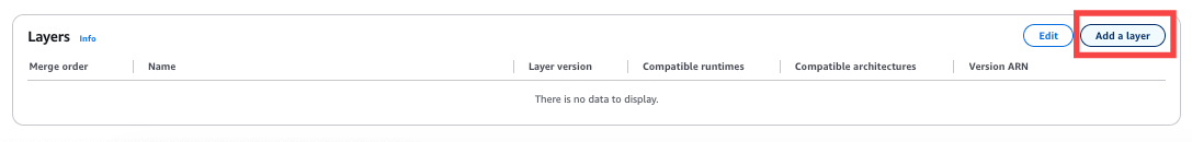 Head over to the Lambda function you defined, and scroll down to a section called Layers, and select "Add a layer". It looks like this: