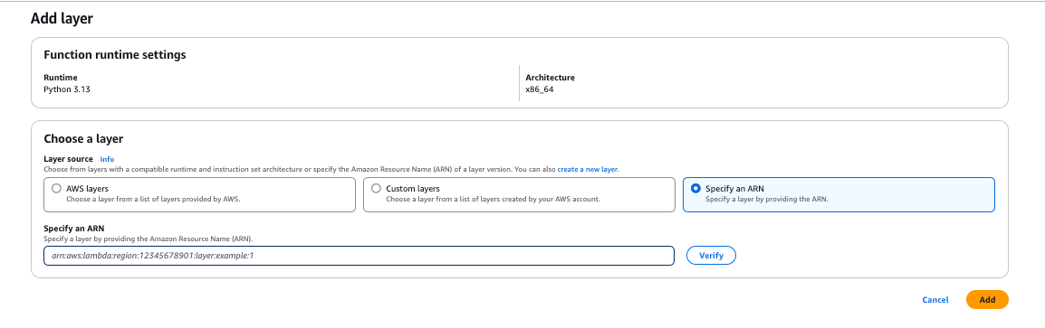 Then, select the "Specify an ARN option" and paste the ARN of the layer you created. Click Add, and it's all ready to use.