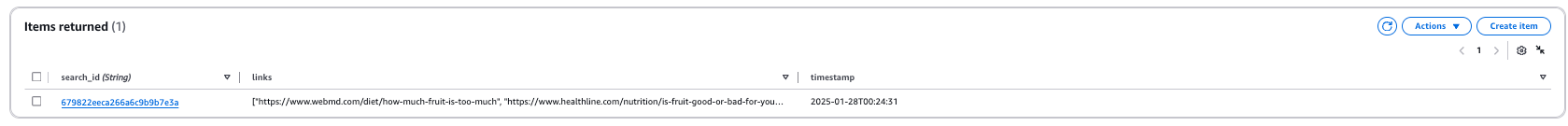 Now, let's say we want to save these results to a database, like DynamoDB. In that case, you can create a DynamoDB table, let's call it SearchResults, and set a partition_key like search_id (String). Then we can return to the Lambda function, and modify the code to store the list of links in the table as an entry, along with the search_id and the timestamp. This would look something like this: