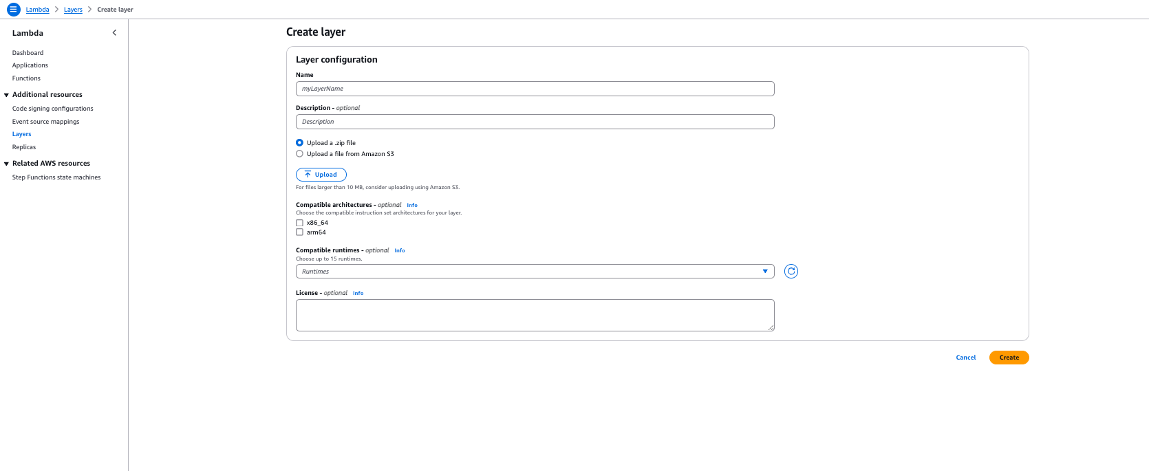 zip -r requests-package.zip pythonOnce you have this .zip file ready, you can head over to the Layers tab on the left panel on the Lambda page and select "Create a new layer".