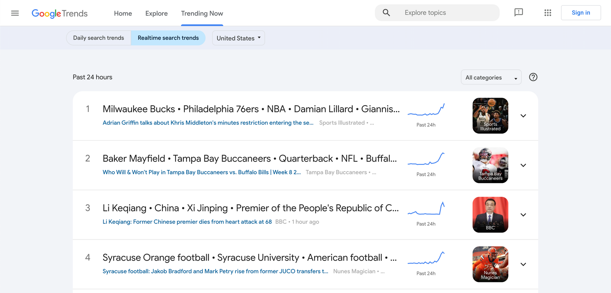 Realtime Search Trends provide a dynamic and up-to-the-minute view of what is currently trending. It usually combines with multiple queries. This section displays topics and search queries as they unfold in real time. Unlike Daily Search Trends, Real-time Search Trends are not confined to a 24-hour window. They continuously update as new trends emerge and fade, making them ideal for tracking breaking news, sports events, and social media trends as they happen.