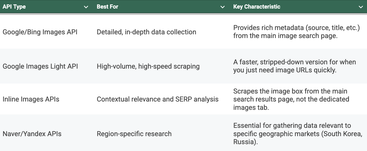 Google Inline Images API: Ever notice the "Images for..." box that appears in the middle of a regular Google search? This API scrapes that specific block. It’s incredibly useful for understanding which images Google deems most contextually relevant for a non-image-specific search query.