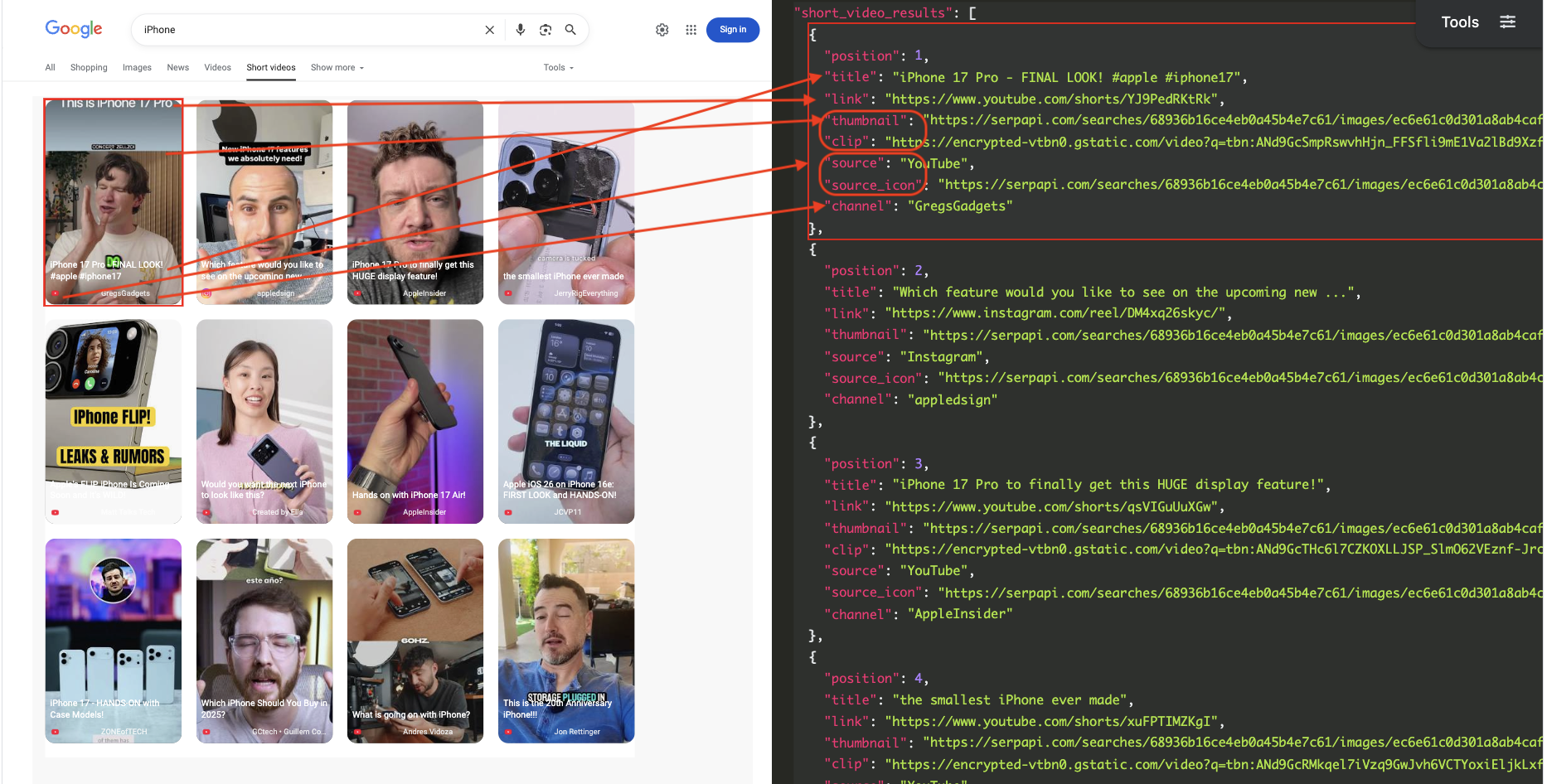 At SerpApi, we have recently added Google Short Videos API to scrape these short videos. Here are the parts our API can scrape for each short video: