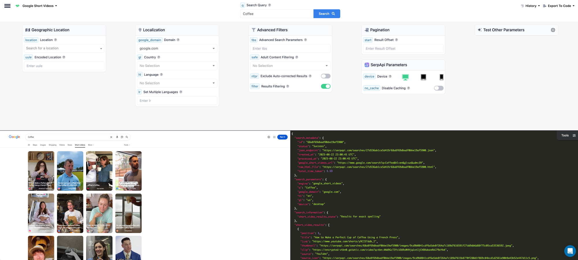 Let's start with visualizing what the response looks like for our Google Short Videos API in our playground: