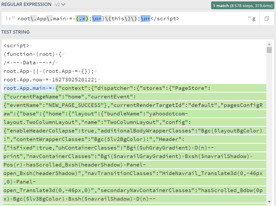 Then, regular expression comes into play to extract JSON string from the <script> tag. Here's a screenshot to see what is being captured (link to regular expression):