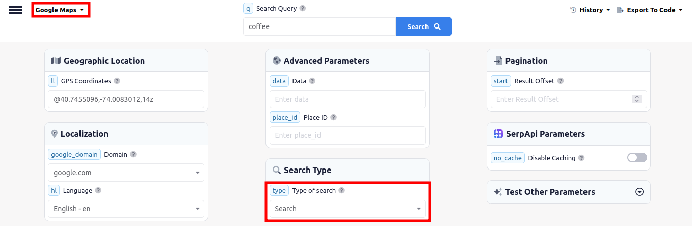 You will also need to specify a q (query) parameter and an ll (GPS coordinates) parameter. The Playground will supply some default values for these after you select the engine and type. In this example we are using the default paramaters provided by the Playground to search for locations with the keyword "coffee" in New York: