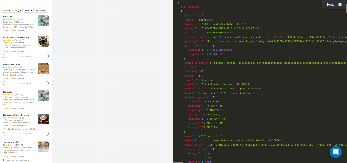 SerpApi streamlines the process of scraping search results pages. Today we will take a look inside the powerful Google Maps API. This feature makes it easy to scrape businesses and locations for info, photos, and reviews. You will see that whether you are starting with name of a specific location, a keyword search for a list of related businesses, or a list of IDs you have collected for a location, you can find the data you are looking for using the right query or sequence of queries. This can be a powerful tool for content aggregators, business owners, entrepreneurs, and others. To see this in action, head to the Playground, where you can try out different search queries and parameters.