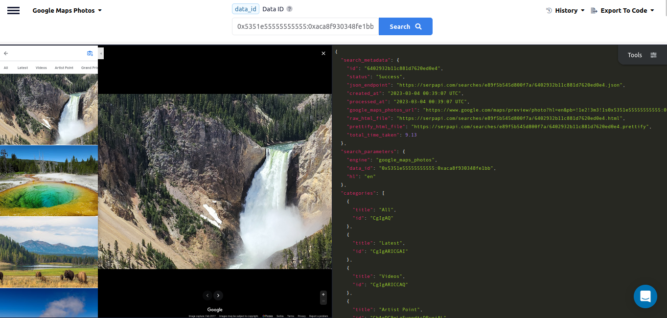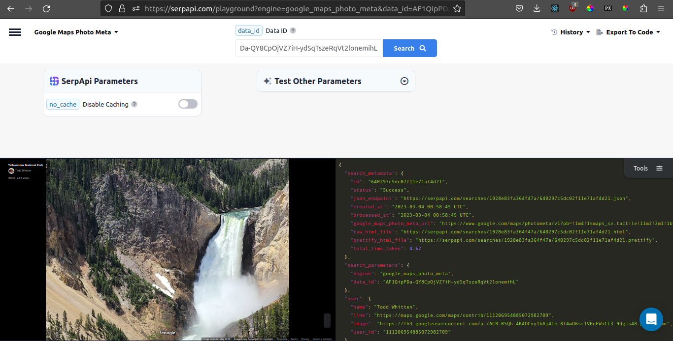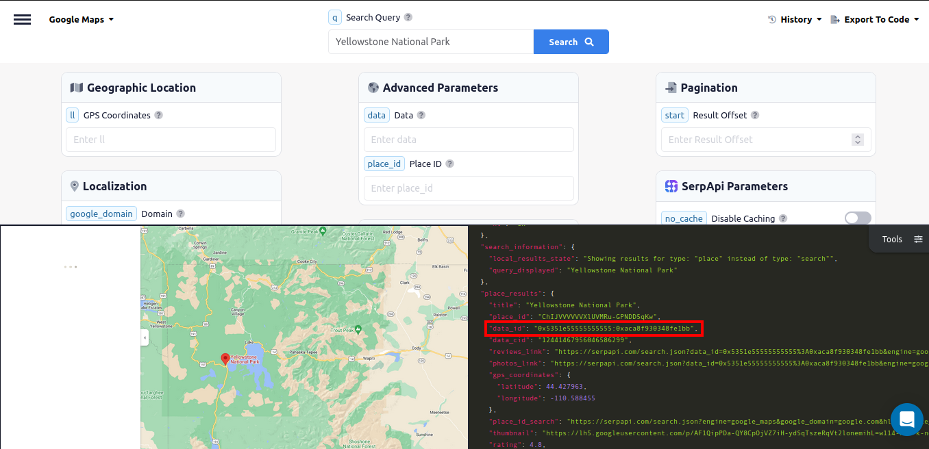 Instead of looking at photos of McDonald's, lets search for Yellowstone Park. First we need to do a regular Google Maps (or Google Maps Local Results) search to get the data_id for the location: