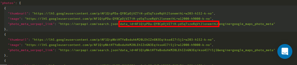 If we want detailed information about the first photo, we will need to get it's data_id from the photo_meta_serpapi_link: