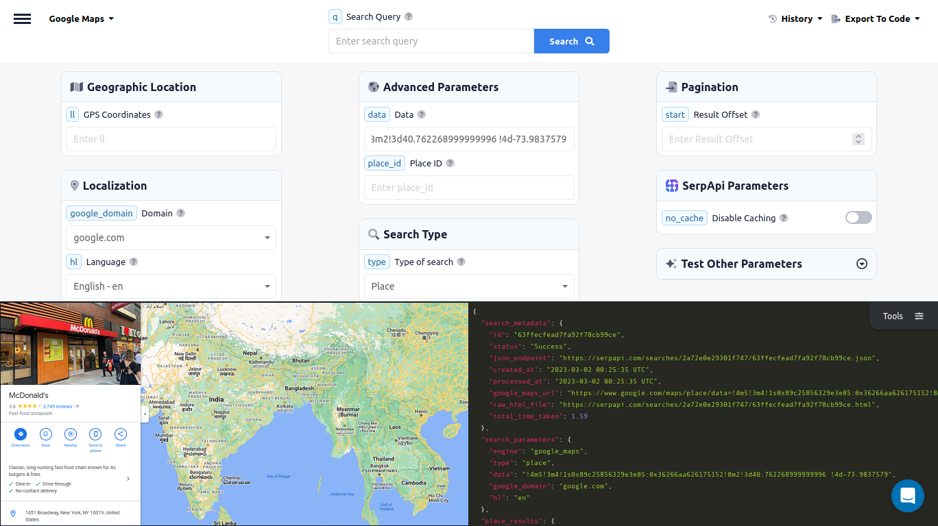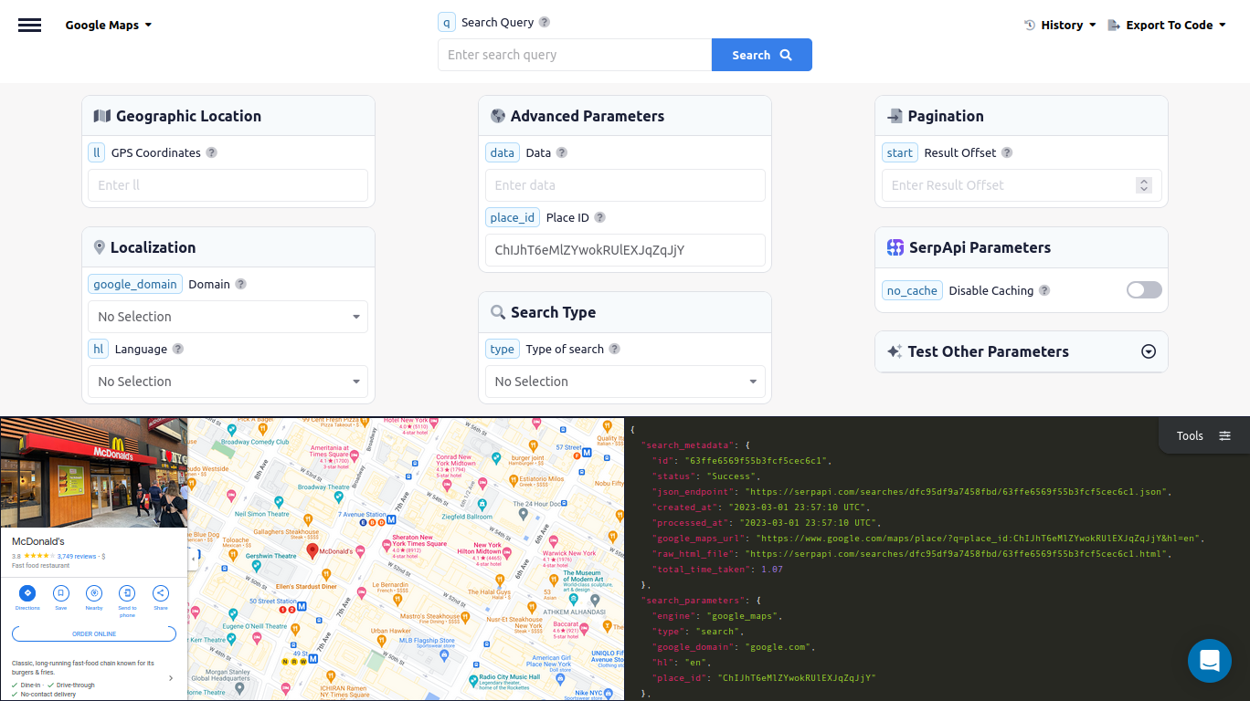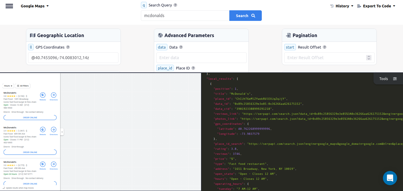 Go back to the Google Maps Local Results API and search for McDonald's.