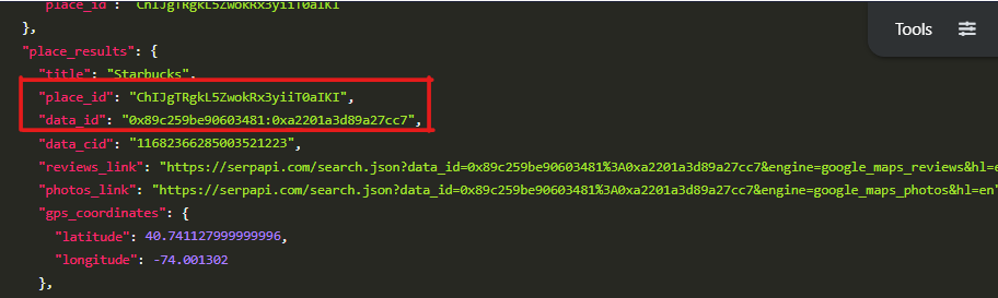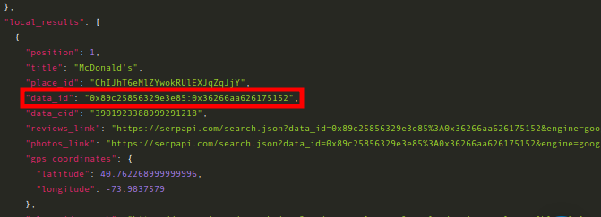 Let's say the top result is the one we are looking for. Scroll down in the JSON output and find the result in position 1, then find the data_id. Just below the place_id we extracted to use with the Google Maps Place Results API, you can see there is a key named data_id .
