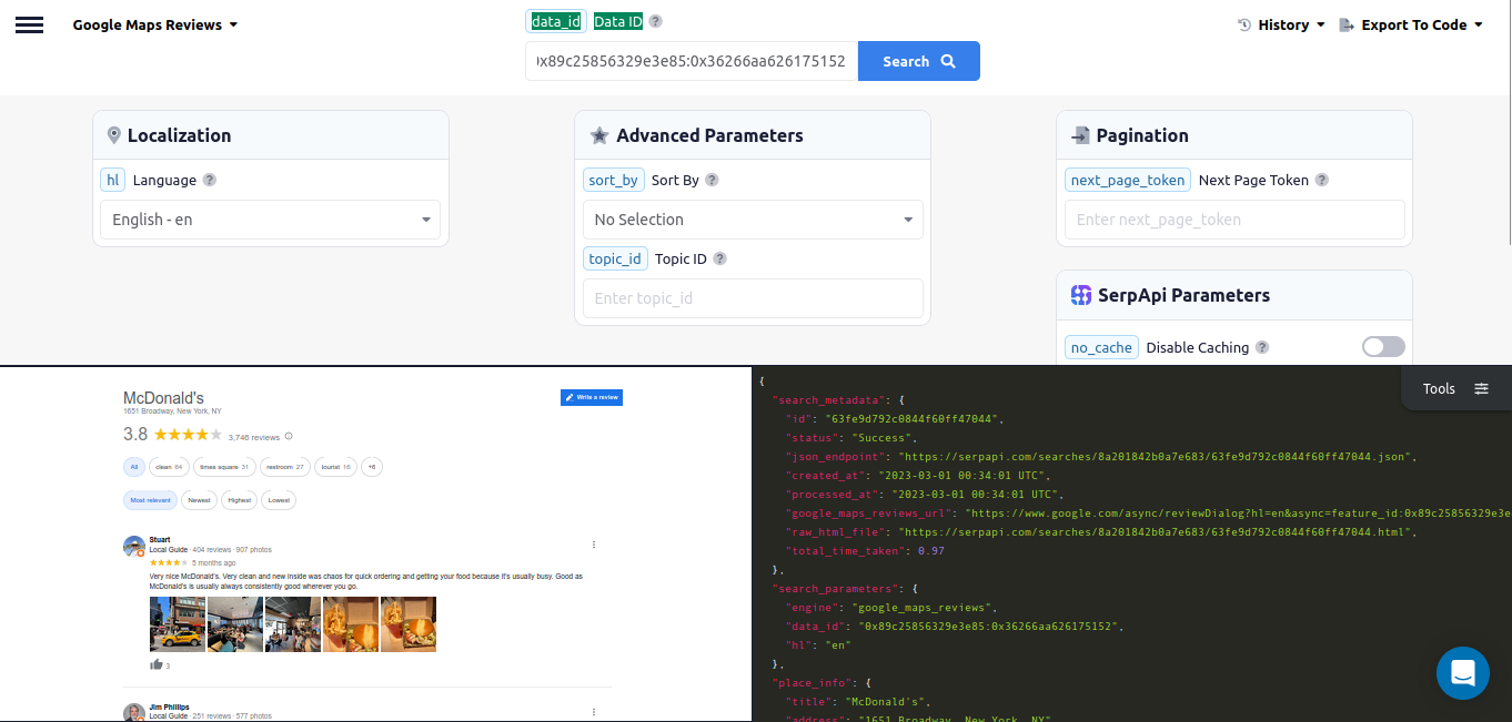 We need the data_id in order to get the reviews for a given business. So if we want to get all the reviews for a nearby McDonald's, we first need to go back to the Google Maps Local Results API and search for McDonald's: