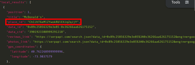 Let's say the top result is the one we are looking for. Scroll down in the JSON output and find the result in position 1. You can see there is a key named place_id.