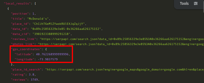 So we will also need the latitude and longitude of the location in order to search for it with the data_id. If you look again at our Google Maps search for McDonald`s you will see that the GPS coordinates are also returned in the results for each location listed: