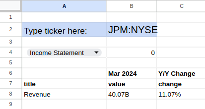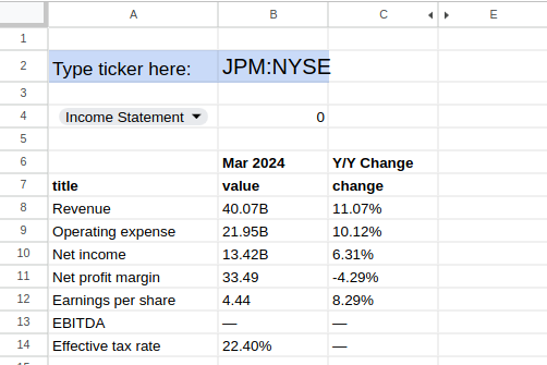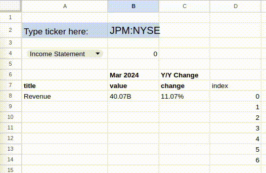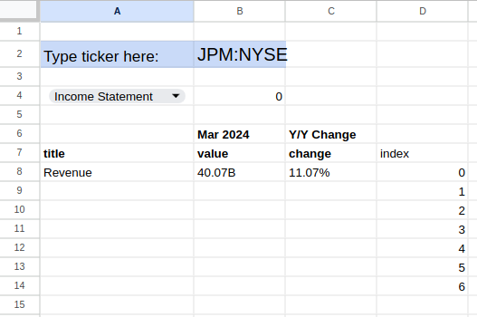 =SERPAPI_RESULT("engine=google_finance&q=" & ENCODEURL($B$2) & "", "financials." & $B$4 & ".results.0.table." & $D8 & "." & C$7)All this is admittedly a bit complicated, but it's a worthwhile investment because now we can drag these formulas down to populate all the other rows of data.