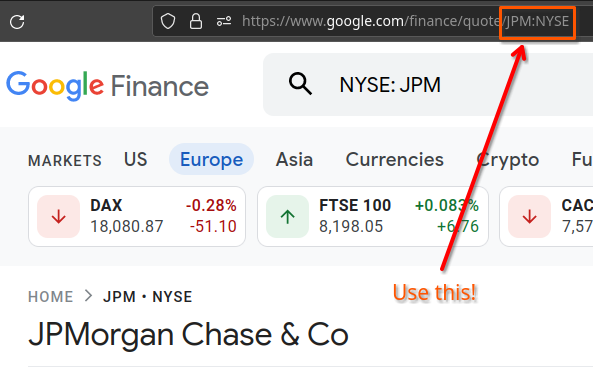 From the company's Google Finance page, you can find the stock ticker and which stock exchange they're listed on. Note that you must use the format used in the URL bar such as stock_ticker:stock_exchange, not the one in the Google Finance search bar with reverse ordering of stock_exchange:stock_ticker. Simply put, JPM:NYSE is valid, but NYSE:JPM is not.
