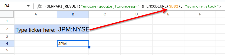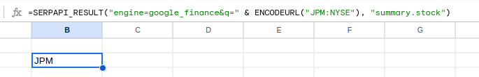 =SERPAPI_RESULT("engine=google_finance&q=" & ENCODEURL("JPM:NYSE"), "summary.stock")If all went to plan, you should see JPM appear in the cell you pasted the formula.