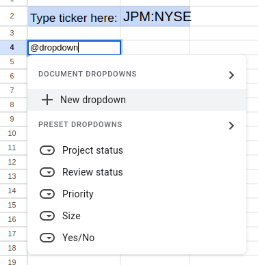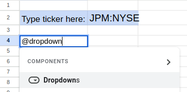 You can create a Google Sheets dropdown by typing @dropdown in a cell and clicking Dropdowns. We'll put this in cell A4.
