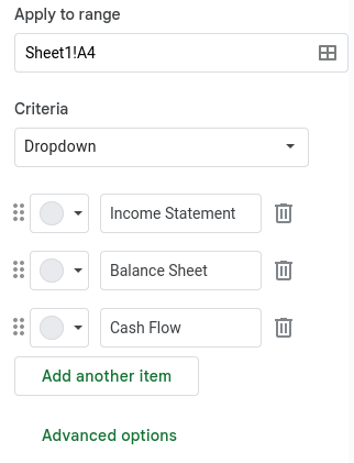 Then in the resulting menu, we'll add our three financial statements. You can also add a color for each option, but I'll skip that.
