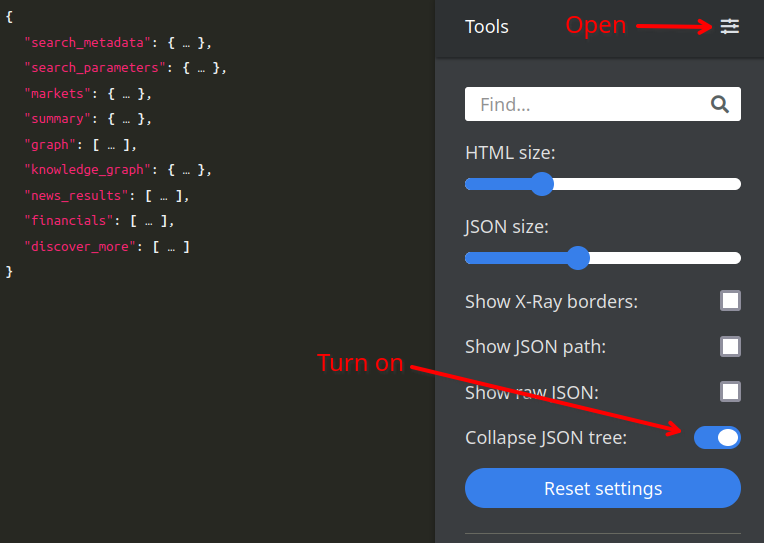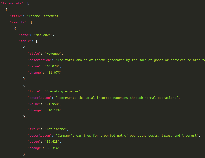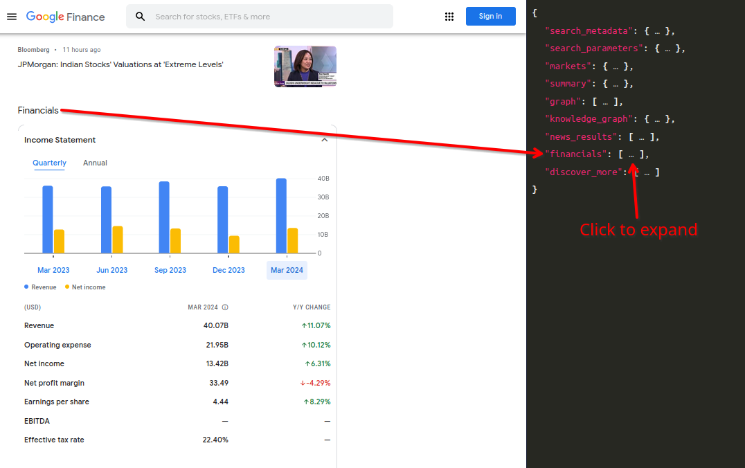 Scrolling down the Google Finance results, we see a "Financials" section that corresponds to a financials key in our JSON response body. Click the [ ... ] next to financials to expand that part of the response.