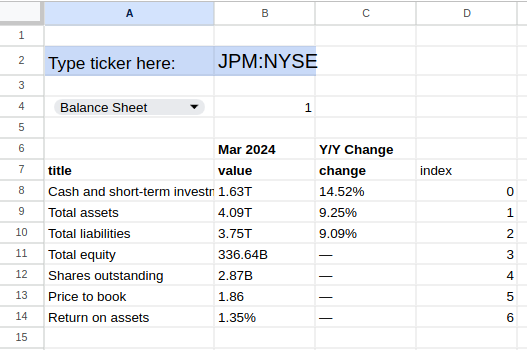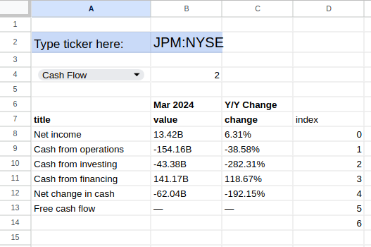 =IF($B$4=2,"",SERPAPI_RESULT("engine=google_finance&q=" & ENCODEURL($B$2) & "", "financials." & $B$4 & ".results.0.table." & $D14 & "." & C$7))And the result: