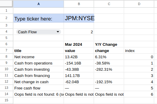 Oops, we get an error in the last row of the Cash Flow statement explaining the field is not found. This happened because the Cash Flow statement has six rows of data instead of seven like the other reports.