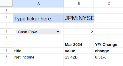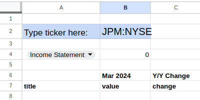 =SERPAPI_RESULT("engine=google_finance&q=" & ENCODEURL($B$2) & "", "financials." & $B$4 & ".results.0.table.0.title")We also want to select the value and change fields. We do that by simply changing the selector value of the above formula as follows: