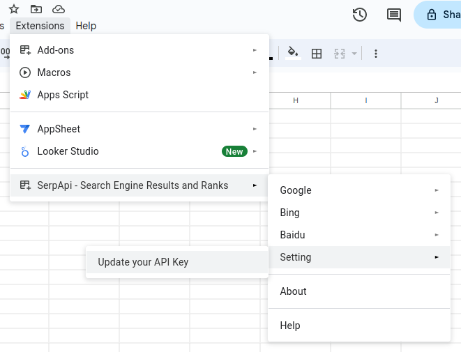 Extensions->SerpApi->Setting->Update your API Keyand pasting your key in the pop up.