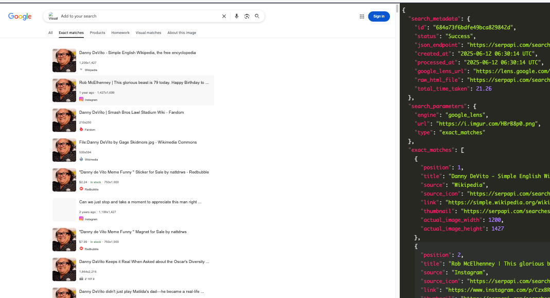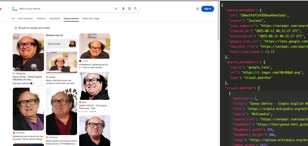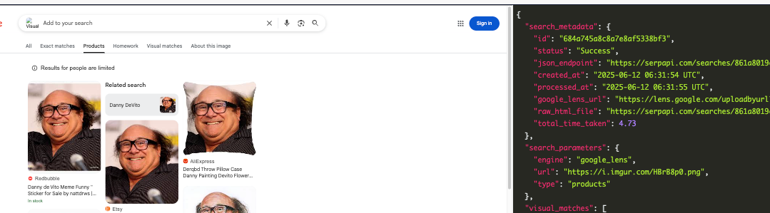 print(response)With these few lines of code, we can access all of the search engines available at SerpApi, including Google Lens. We'll need to adjust the parameters based on our needs.